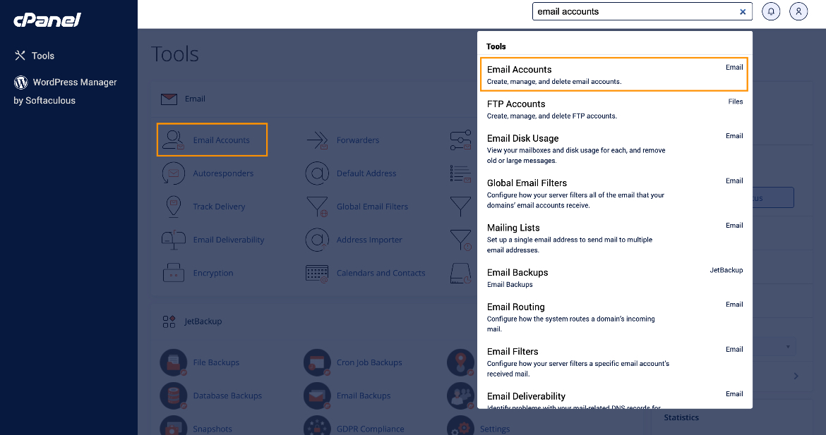2. Once you’re logged in to your cPanel dashboard, go ahead and type in Email Accounts on the top right search bar, or if it’s visible on the dashboard, you can go ahead and click the Email Accounts option under the Email section.